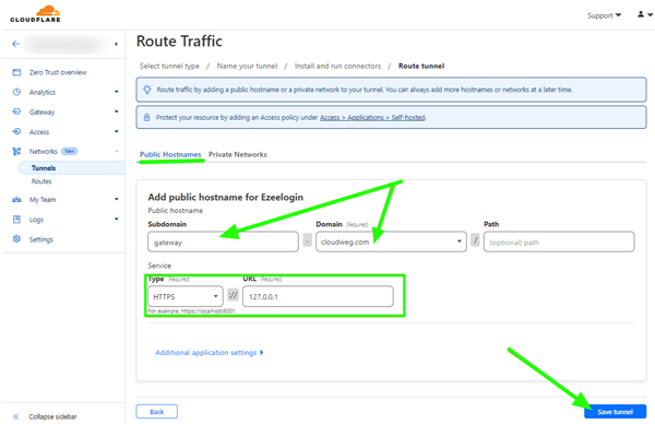 Step 3.1. Choose a Domain and specify any subdomain (eg: gateway). Select HTTPS/HTTP and enter the URL 127.0.0.1 or localhost. You can select any domain which is already added to the Cloudflare account.