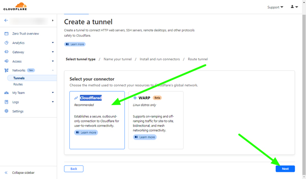 Step 1.3 Click and Create tunnel and select Cloudflared connector, then click next